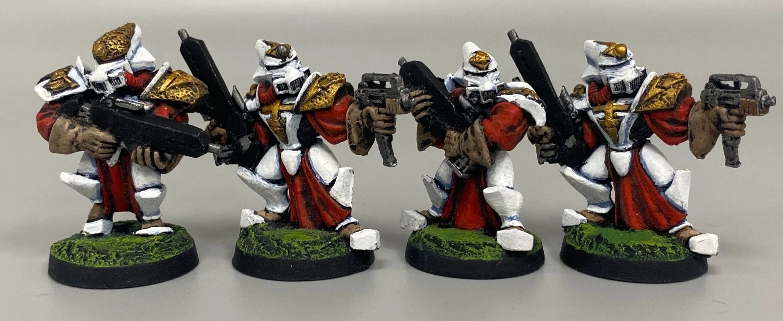 Miniature dall'armatura bellissima, e in questa foto dipinte magistralmente, la prima cosa che stupisce guardando il profilo di questa unità è che non hanno alcuna abilità. Sembra un assurdo, invece la loro forza sta tutta nelle caratteristiche; fatta eccezione per la ferita unica, tutte le altre caratteristiche sono al livello di un eroe, incluse le quattro azioni. Anche loro hanno una spada violentissima che effettua sciabolate, e una pistola Punisher. Il sergente invece ha la pistola Avalanche, un filo migliore.