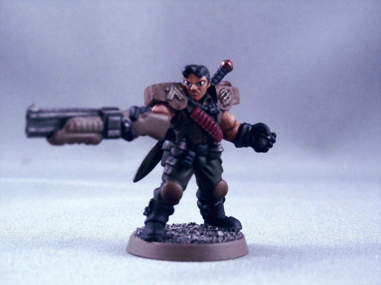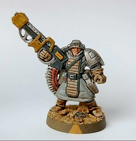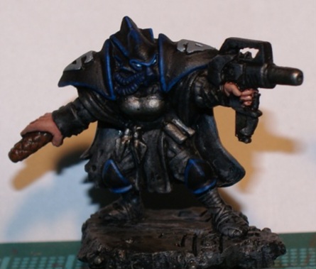 Il Badass incarna alla perfezione lo stereotipo classico del mercenario esaltato, duro e cazzuto. Quello (riporto dalla descrizione) con il sigaro in bocca, alto quasi due metri, radiato per insubordinazione, con muscoli enormi. In effetti il suo profilo è spaventoso, con valori da corpo a corpo e tiro altissimi, quattro azioni, tre ferite, una buona armatura, un valore di disciplina un po' basso (perfettamente in linea con la descrizione) ed una forza altissima, che consente di sparare perfino con una Nimrod senza bisogno di imbracciarla. Gioco forza, quindi, che quando ho visto questa conversione in file 3D con una Nimrod in mano, il sigaro in bocca, e la benda sull'occhio, ho pensato che fosse semplicemente perfetto.
