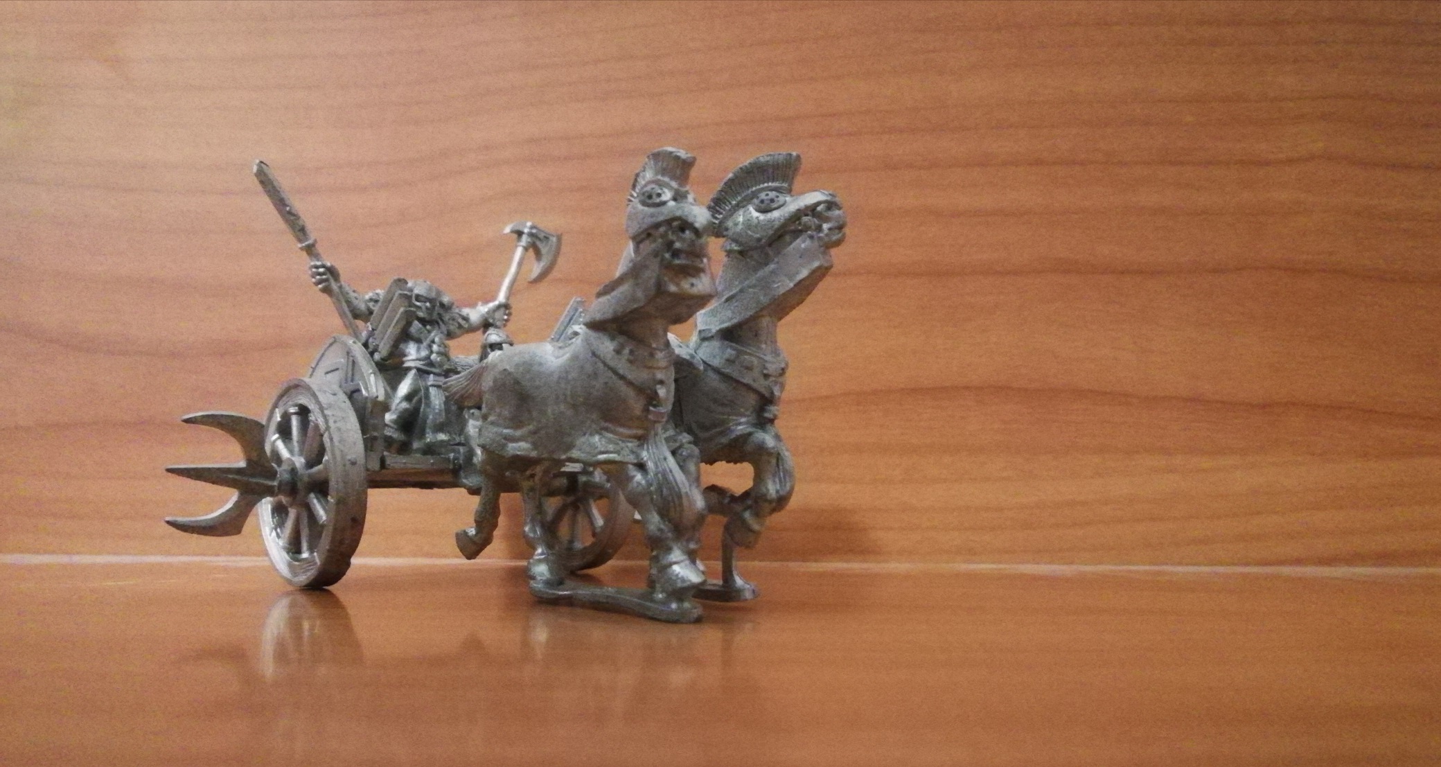 Il carro... eh, sì, anche questo è stato rivisto in meglio. Intanto nel costo, un centone tondo tondo che semplifica di molto la costruzione dello schieramento. E poi nel danno d'insieme che genera. Ok, ha solamente due abilità (ferocia e commanding presence) e mi è capitato di averlo bloccato per un fallimento critico sulla paura generata da una fanteria ogre (assurdo e ridicolo) ma di per sè il pezzo ha ben 4 ferite, due cavalli ognuno dei quali fa danno, un simpatico "trample", che se si evita richiede comunque di scappare (con LD dimezzata) anche dalle lame laterali che spazzano via tutto ciò che incontrano entro un pollice dalle ruote, e il guerriero sopra tira giavellotti a piacere (dato che può tirarli unitamente all'azione di movimento) e all'occorrenza tira una roncolata di passaggio con l'ascia. Insomma, in certi scontri potrebbe essere solo un baraccone superfluo, ma in altri potrebbe davvero fare la differenza. Soprattutto se schierato in coppia, ipotesi comunque pensabile anche a 1000 PA di armata, volendo.