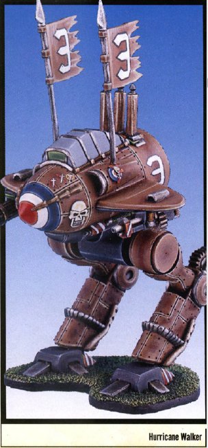 Il bipode è un modello gigante, che può essere curato solo dalla Gray Ghost, e che prevede tre versioni possibili, con differenti armamenti. Siccome però cambia anche il profilo ed il costo, noi ci siamo attenuti a quello della miniatura effettiva (ormai rarissima e che non speravo di recuperare) e cioè l'Uragano "mietitore" che è equipaggiato con due mitragliatrici pesanti (Una Charger ed un Deathlockdrum).